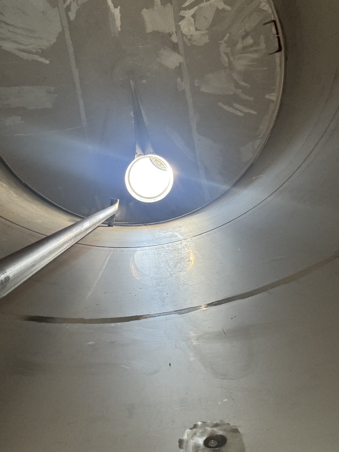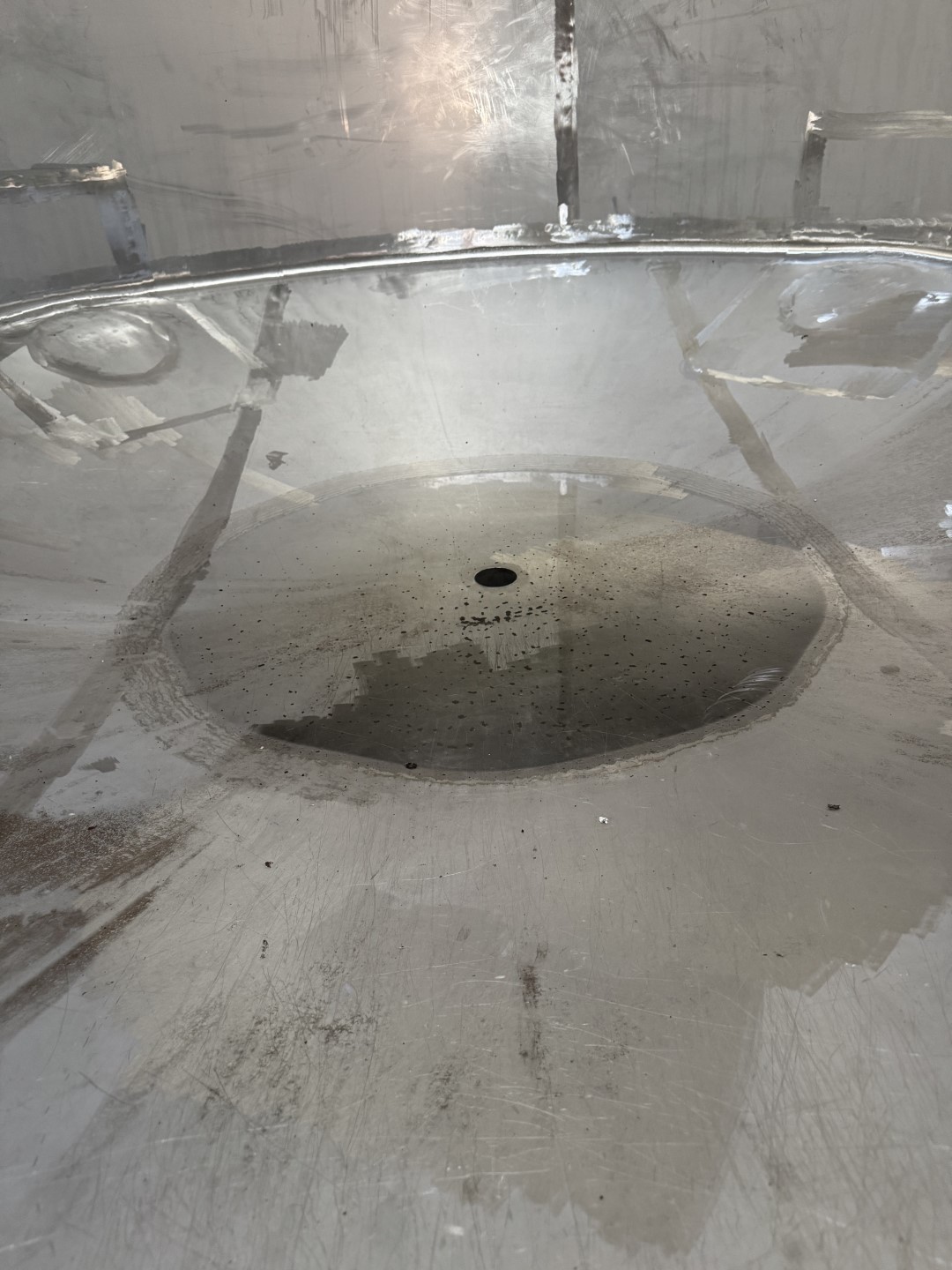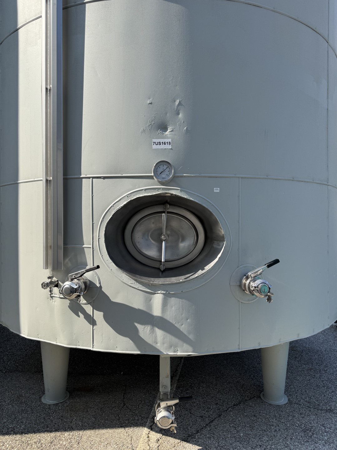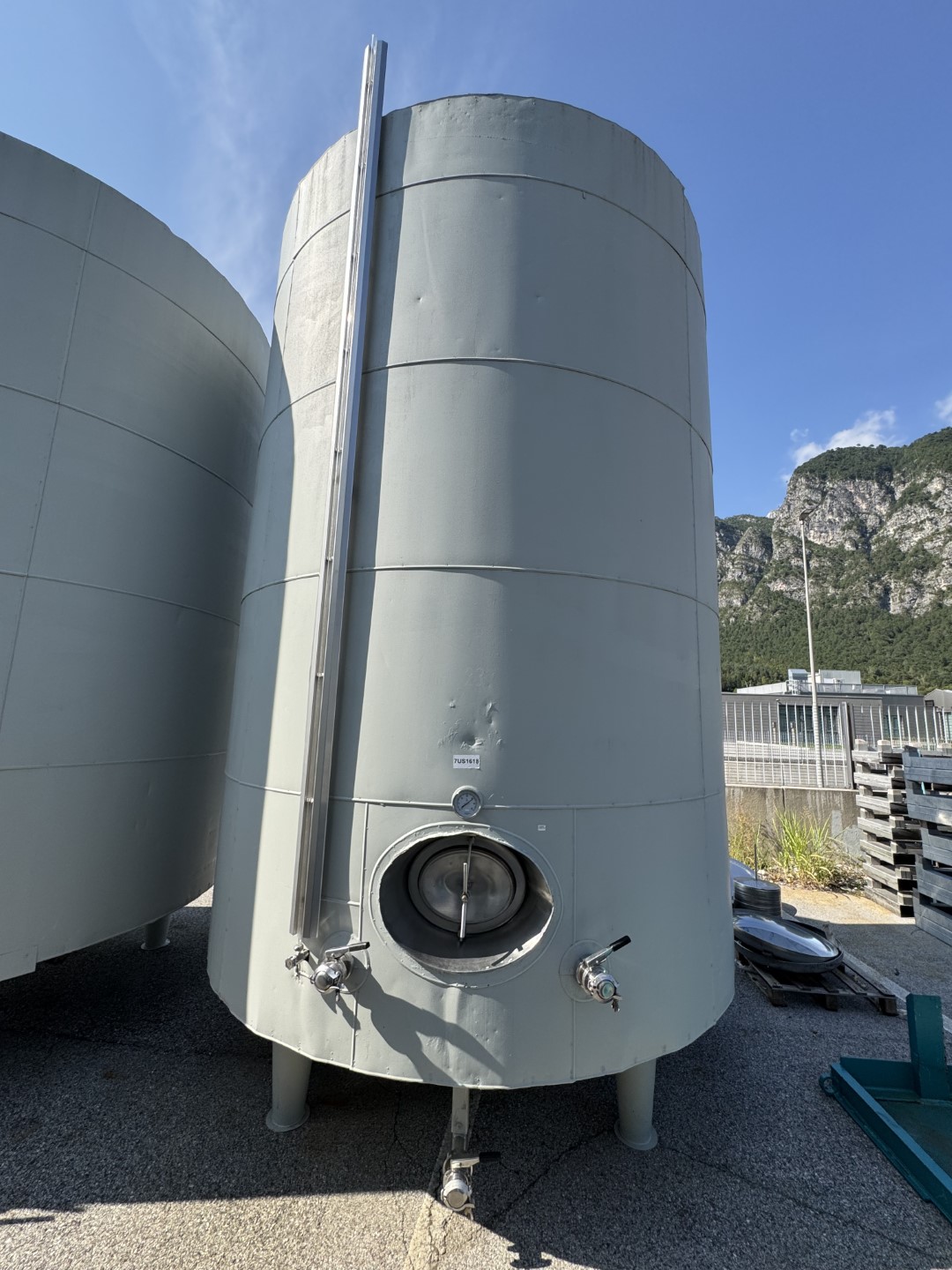 Serbatoio da stoccaggio HL. 240 in acciaio inox. Fondo inferiore conico, chiusino superiore con sfiato, portella ellittica, scarico totale e scarico parziale 1″1/2 – GA 50, piedi chiusi fissi, termometro.