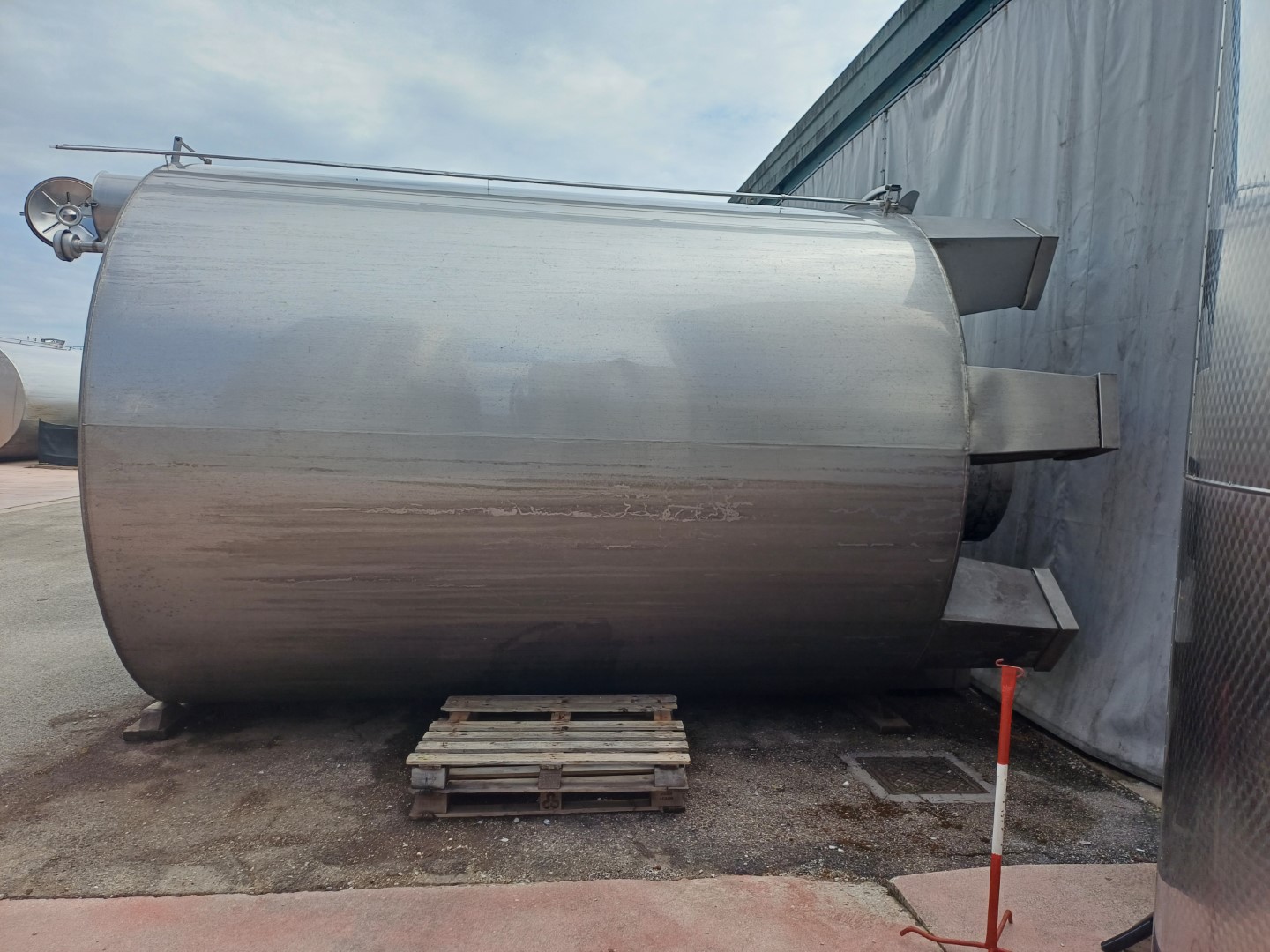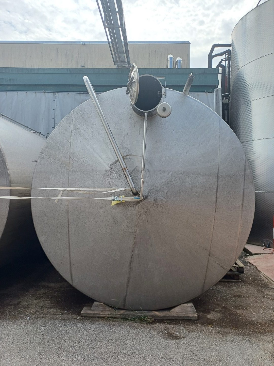 Serbatoio da stoccaggio HL. 300 in acciaio inox. Fondo inferiore conico, chiusino superiore con sfiato, portella circolare a filo fondo, scarico totale e scarico parziale 1″1/2 – GA 50, piedi chiusi fissi, asta livello, rubinetto assaggia vino.