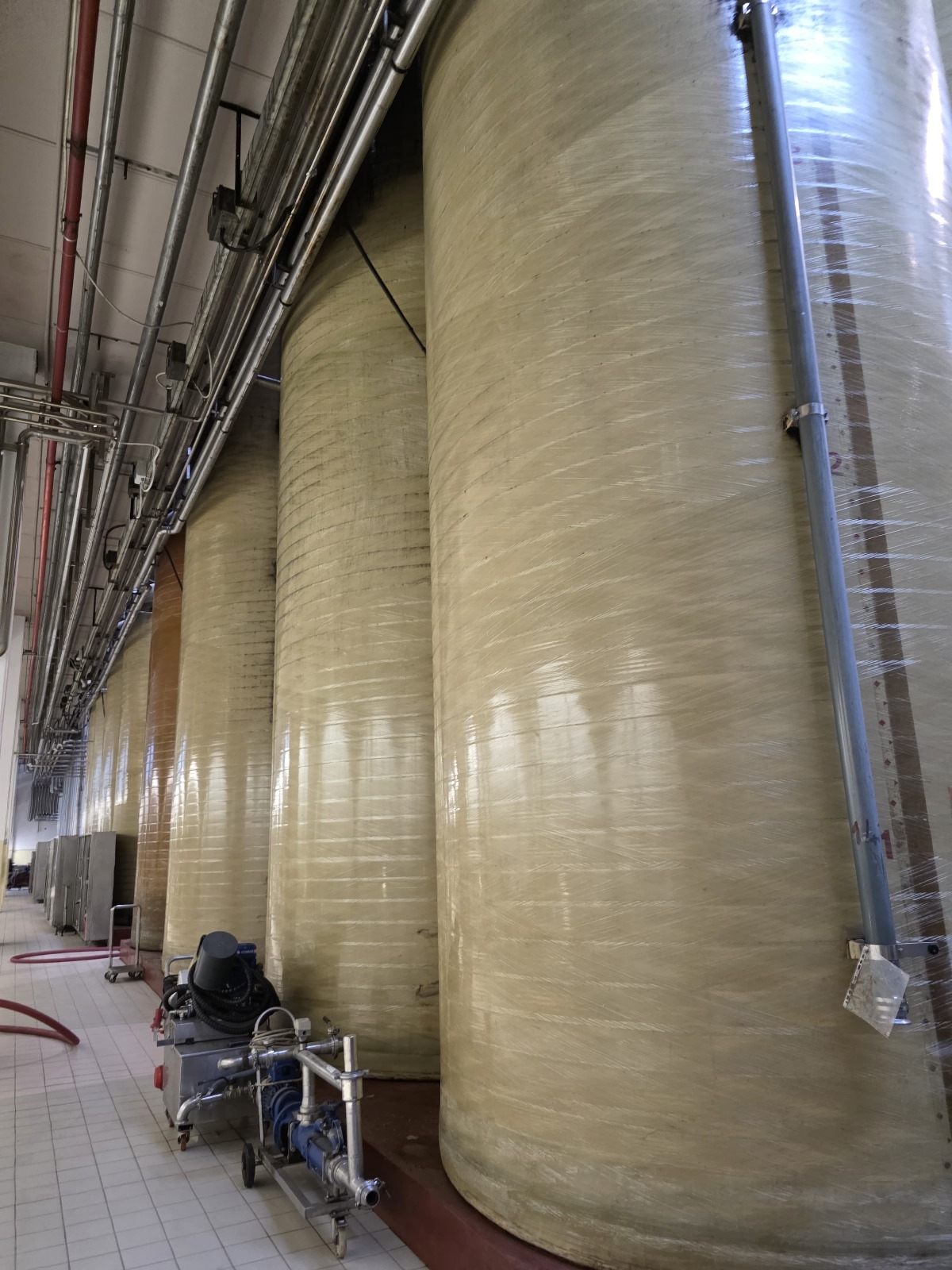 Serbatoio da stoccaggio HL. 800 in vetroresina. Fondo piano su base cemento, portella, scarico totale e parziale, tubo di rimontaggio, preleva campioni.