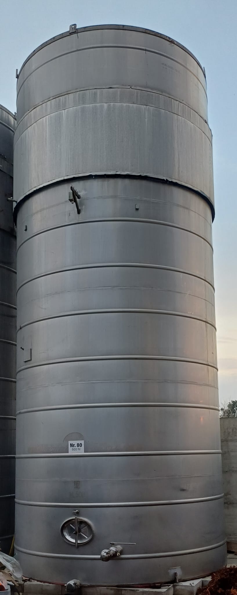 Serbatoio da stoccaggio HL. 500 in acciaio inox. Portella ellittica, scarico totale e scarico parziale GA 80, assaggiavino e tubo di rimontaggio.
